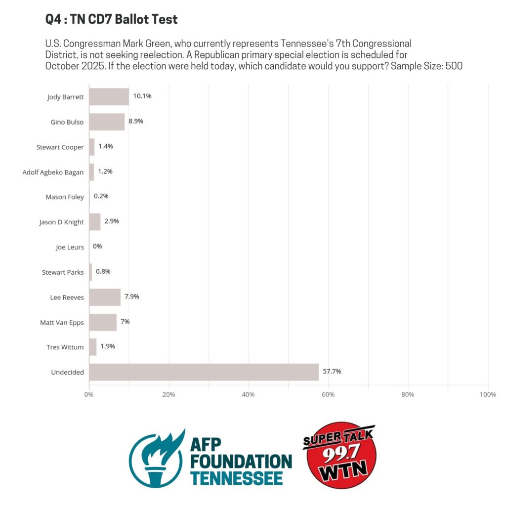 Bulso embraced the results. “From day one, this campaign has been about giving voters in the 7th District a proven conservative they can trust to defend President Trump’s agenda and fight for Tennessee values,” Gino said. “I am deeply grateful to every supporter who has joined our cause, and this poll shows our momentum is real.”