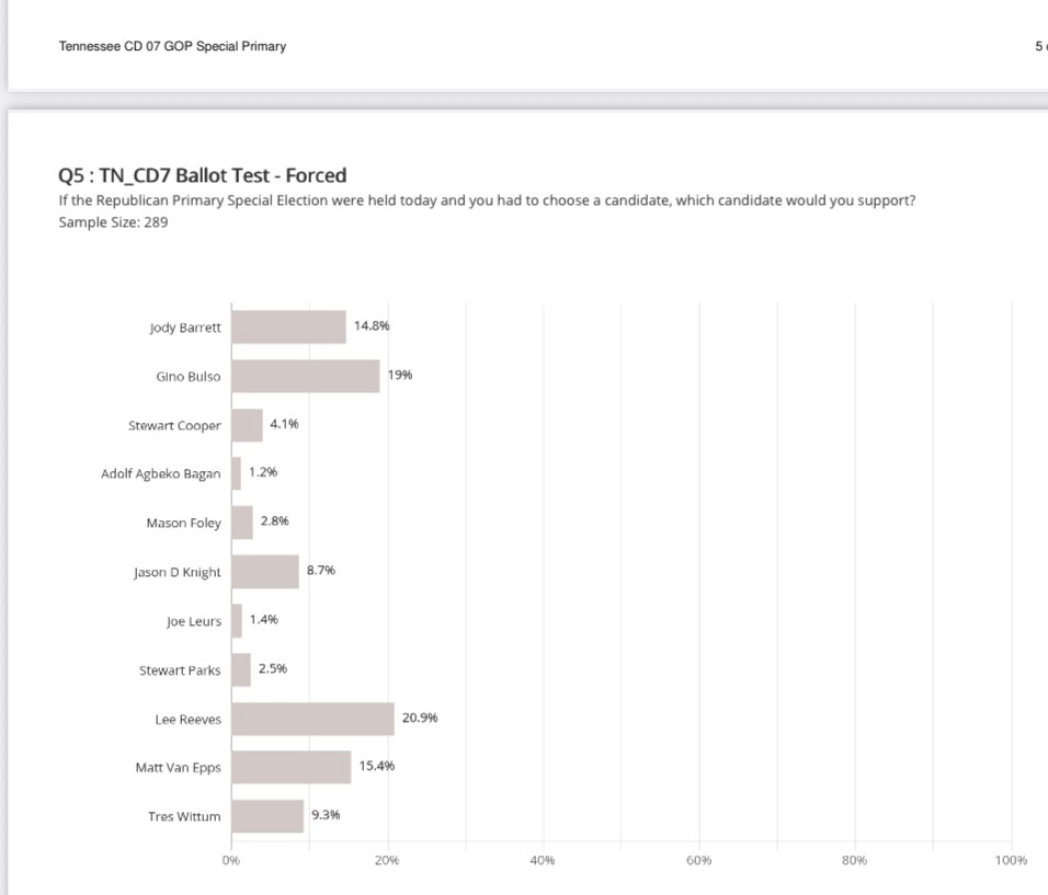 Three Republican state representatives have emerged as slight frontrunners based on the polling: Lee Reeves of Franklin, Gino Bulso of Brentwood, and Jody Barrett of Dickson. Matt Van Epps is the fourth front-running candidate, who formerly served in the Bill Lee administration.