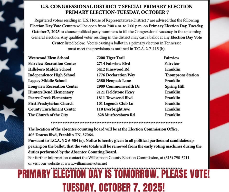 Meanwhile, the Williamson County Republican Party is seeking to spur some vote to turnout Tuesday by pointing out that putting locations across the county will be open tomorrow. Early voting in this special election has been particularly anemic through the end of early voting last Thursday.