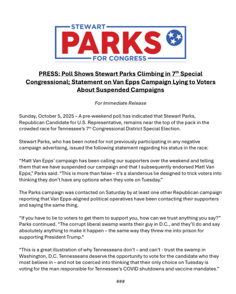“Matt Van Epps’ campaign has been calling our supporters over the weekend and telling them that we have suspended our campaign and that I subsequently endorsed Matt Van Epps,” Parks said. “This is more than false – it’s a slanderous lie designed to trick voters into thinking they don’t have any options when they vote on Tuesday.”