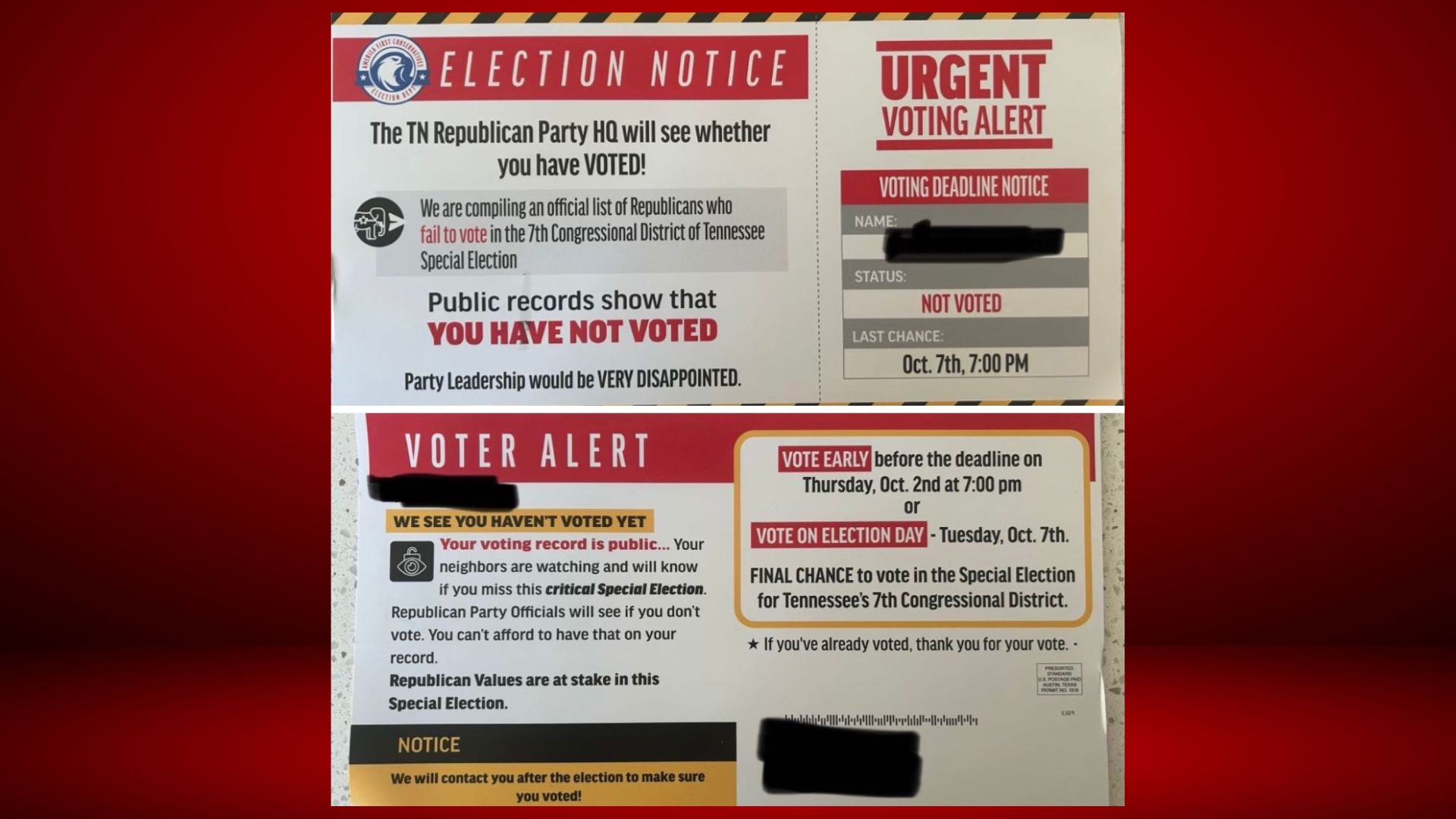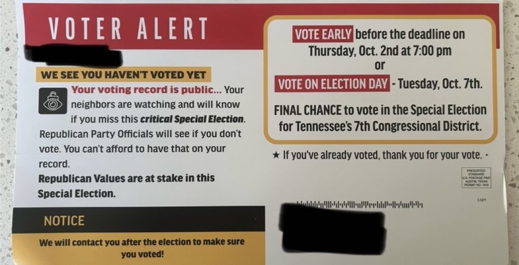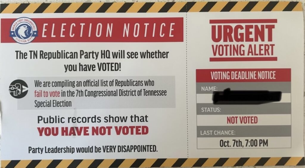 Tennessee Republican Party Chairman Scott Golden says neither he nor anybody associated with the state party had anything to do with this mailing. “Anything we distribute always contains our disclaimer,” Golden said. “And while we encourage everybody to vote, this is not how to do it. We are definitely not keeping a list of those who fail to vote for future punishment, as this clear case of illegal voter intimidation implies.” Golden indicated that he has already talked to the US Attorneys office and intends to get to the bottom of who paid for, printed and distributed this postcard.”