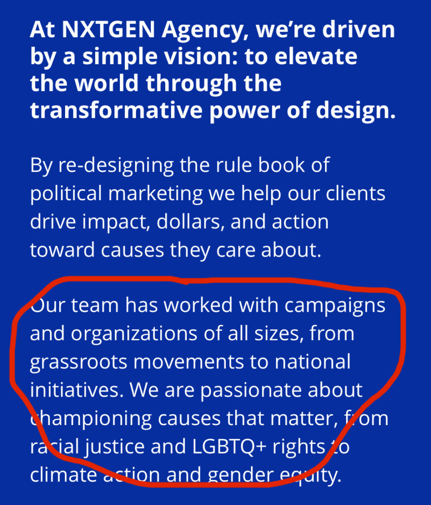But most importantly, his selection of his web designer reveals a lot more. The company HE chose is NXT Gen Agency. Their own site touts the fact that they focus on left-wing causes and candidates. “Our team has worked with campaigns and organizations of all sizes, from grassroots movements to national initiatives. We are passionate about championing causes that matter, from racial justice and LGBTQ+ rights to climate action and gender equity.“ Not exactly the sort of stuff that would lead a true conservative independent to select them to help select the conservative congressman from Tennessee.