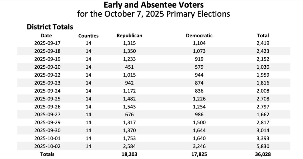 Early voting turnout on both the Democratic and Republican sides of the aisles in the special election primaries for Tennessee’s 7th Congressional District remains well below expectations. The fact that Democrats have nearly matched Republican votes at the end of early voting in a district that was drawn with a 10+ or better republican composition is raising alarm bells for the GOP.