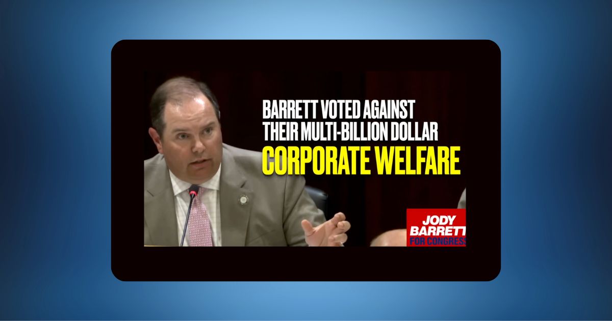 Narrator: “First, the Never Trump Club for Growth attacked Donald Trump, then J. D. Vance. And now, Jody Barrett. Barrett voted against their multi-Billion dollar corporate welfare handouts, blocked Covid Mandates and stopped Red Flag Gun Confiscation. RINO Never Trumpers hate Jody Barrett. Because Jody Barrett ALWAYS puts taxpayers first.