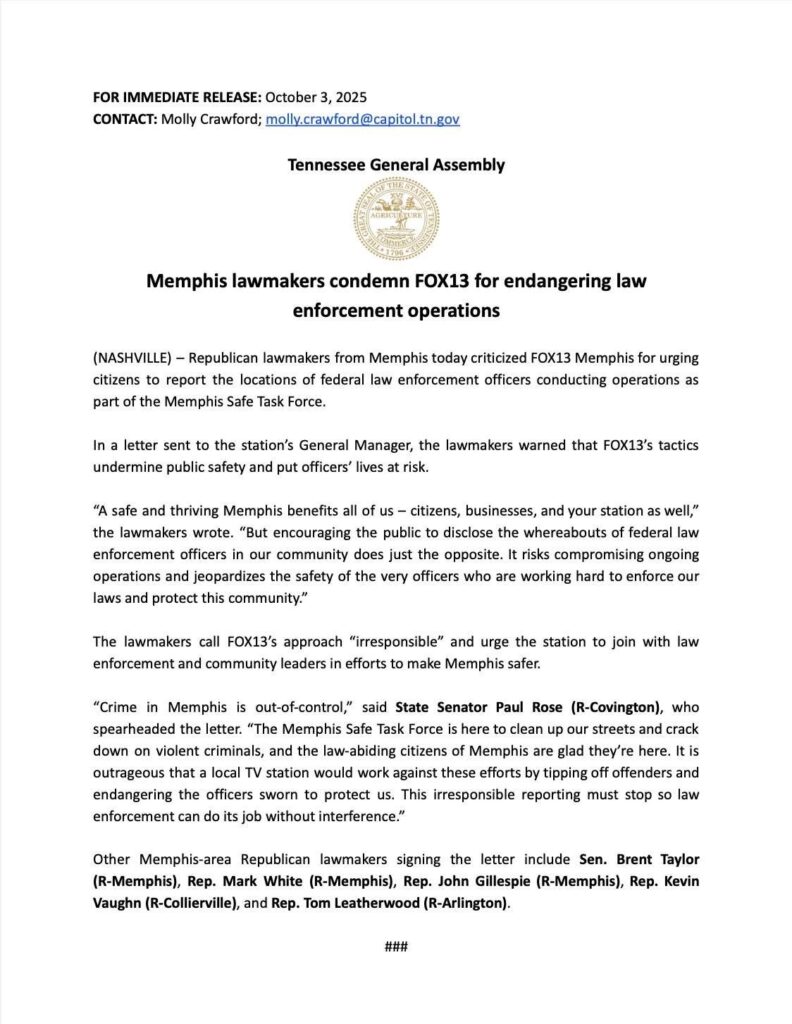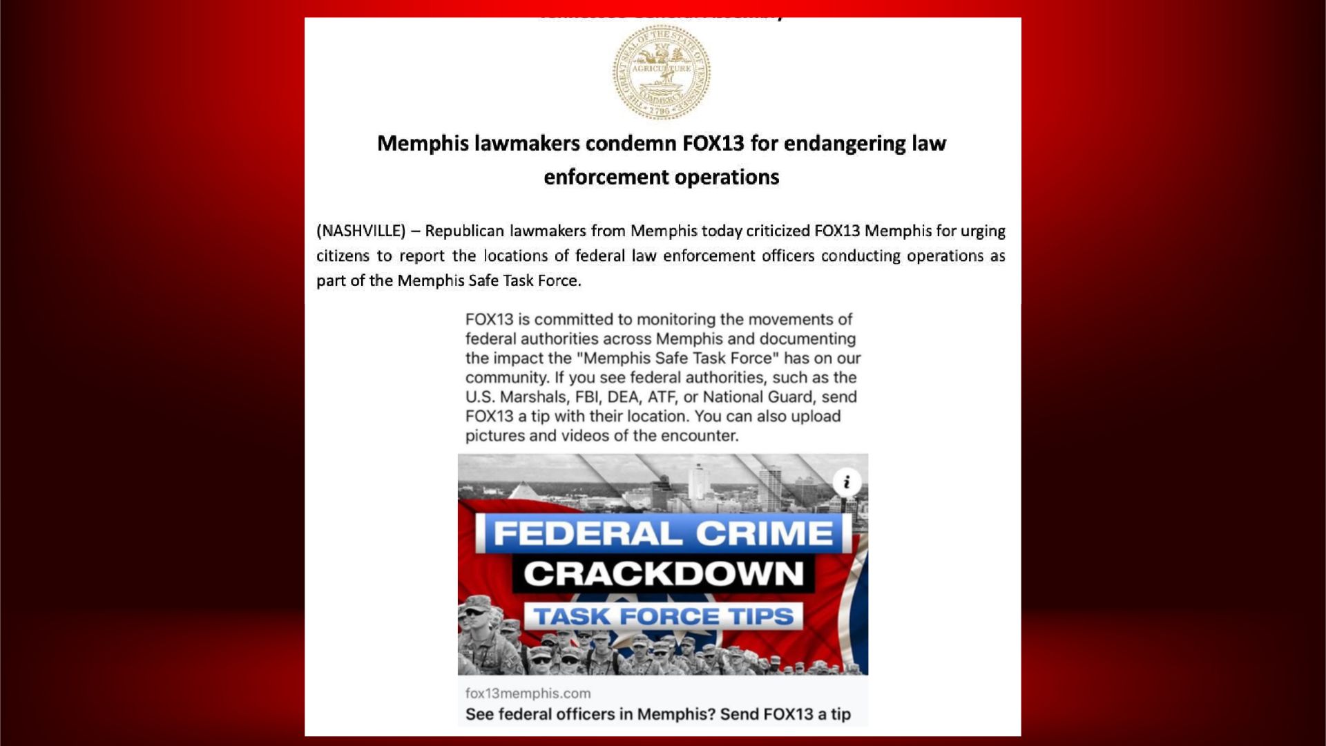 Shelby County’s Republican delegation has sent a letter condemning Fox 13 in Memphis for encouraging interference with law enforcement. The letter accused the television station of “urging citizens to report the locations of federal law enforcement officers conducting operations as part of the Memphis Safe Task Force.”