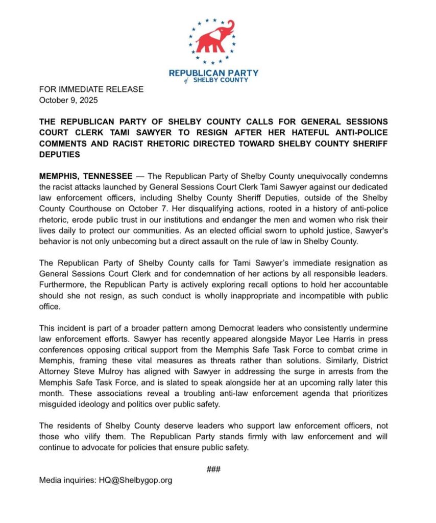 “With the Memphis Safe Task Force in town arresting routine and violent criminals and restoring law and order, some of those arrests and tickets will be going through Tami Sawyer’s General Sessions Clerk’s Office. Do we believe she has the morals, let alone the skills, to process these cases efficiently so we can clean up Memphis crime while she publicly trashes law enforcement and the federal resources coming to clean up crime?”