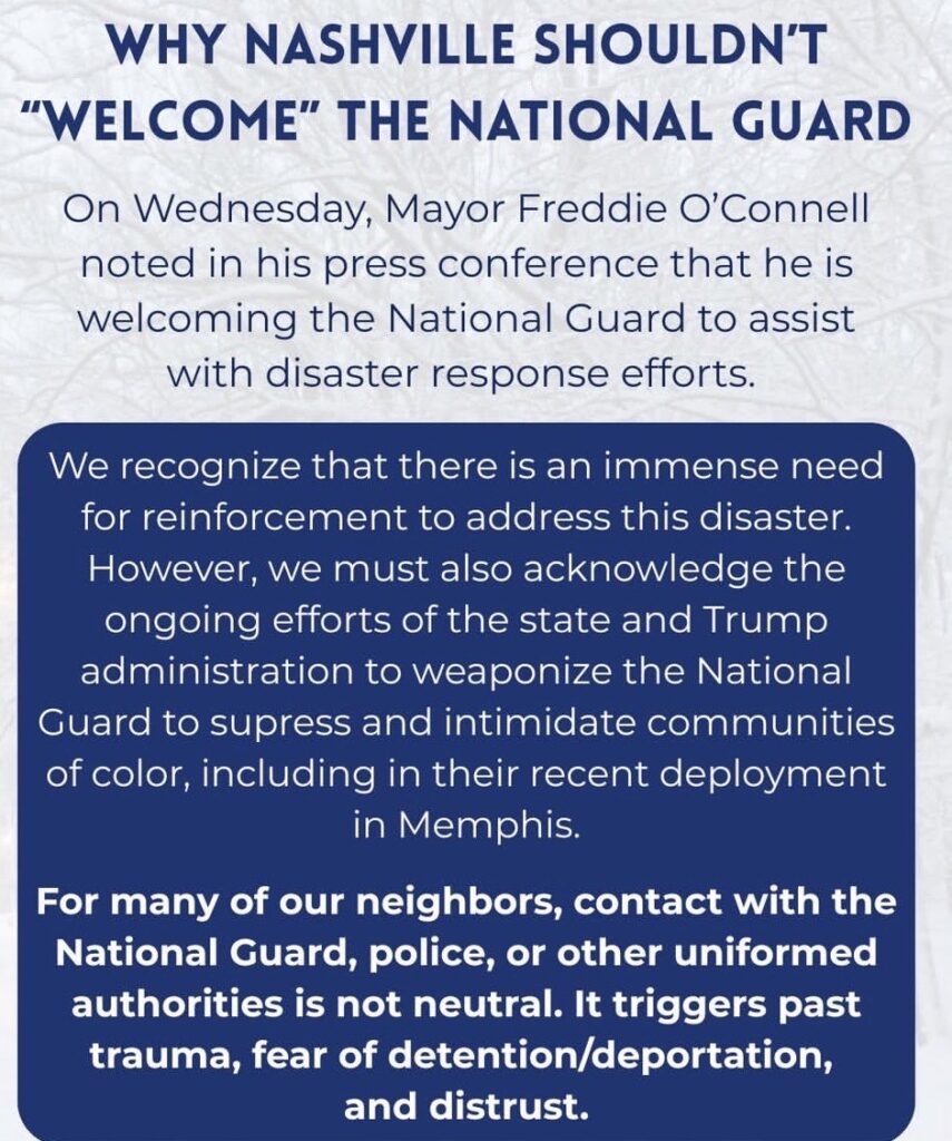That same organization appears to have influenced the delay in Nashville Mayor Freddie O’Connell allowing the deployment of the National Guard to assist in the ice storm recovery. At least one Metro council member has claimed the delay in deploying the Guard was to avoid the optics of having military personnel on the streets of Nashville, which might alarm the illegal immigrant community and give the appearance of the ICE crackdown on illegals in Memphis. In fact, The Remix Way issued online disaster response recommendations on January 29 that reflected those exact concerns, among others.