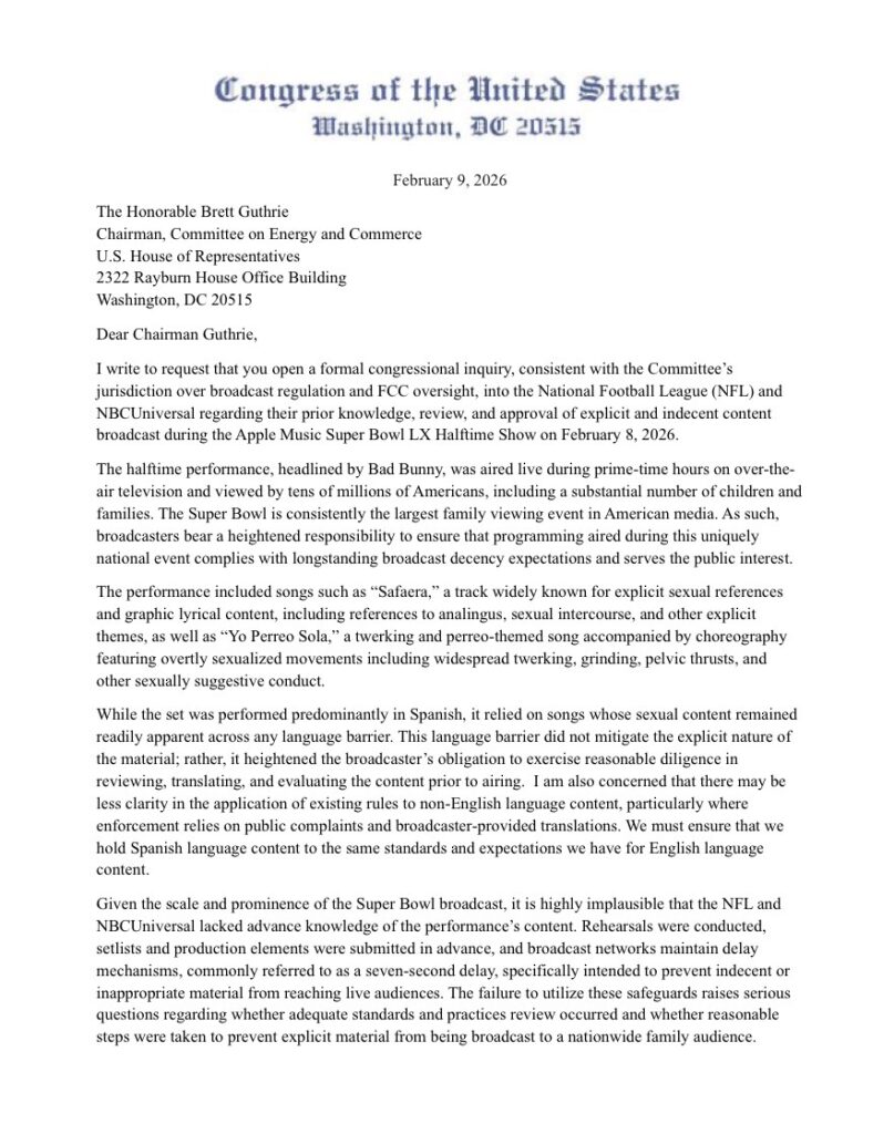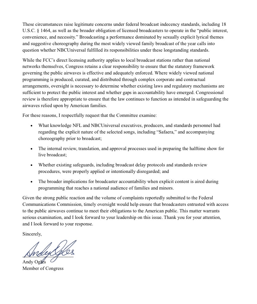 Congressman Andy Ogles (TN-05) is requesting that the Energy and Commerce Committee launch a formal congressional inquiry into the National Football League and NBC immediately for their prior knowledge, deliberate approval, and facilitation of the Apple Music Super Bowl LX Halftime Show, which featured explicit displays of sexual acts and lyrics on national television that represent a clear violation of FCC guidelines.