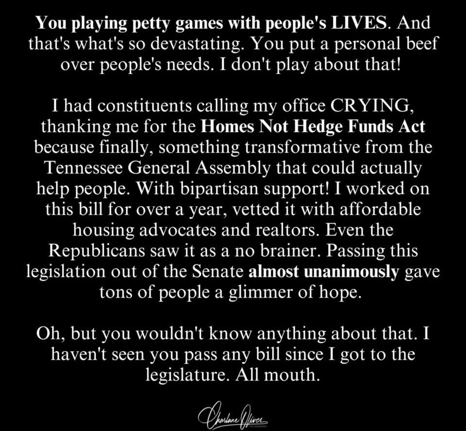 Democrat State Sen. Charlene Oliver erupted on social media last week after one of her bills was killed…and it came at the hands of a fellow Democrat. The controversy revolves around the Homes Not Hedge Funds Act that easily passed in the State Senate on March 9 by a 31-1 vote. Oliver was the Senate sponsor of the bill, which clearly had bipartisan support. The House sponsor is Aftyn Behn, another Nashville Democrat.