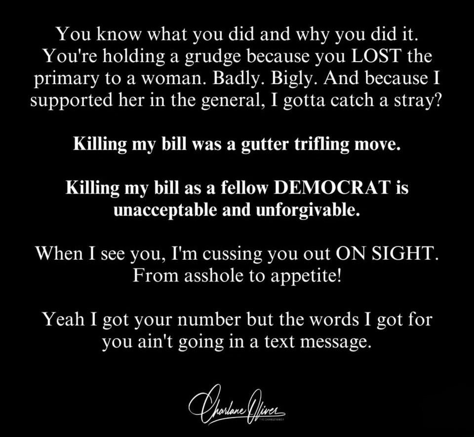 Oliver and Behn aren’t buying Mitchell’s explanation and Oliver took to social media to express her opinion of him. “F-CK YOU, Bo Mitchell,” Oliver wrote in a social media post. “You a low-down, backstabbing, misogynistic punk ass b-tch. You know what you did and why you did it. You’re holding a grudge because you lost the primary to a woman. Badly. Bigly. And because I supported her in the general, I gotta catch a stray? Killing my bill was a gutter-trifling move. Killing my bill as a fellow Democrat is unacceptable and unforgivable.”