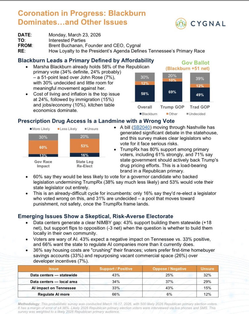 The Blackburn campaign has circulated a new Cygnal poll that shows her leading Rose by 51 percentage points. The poll of likely voters has Blackburn with 58% support among primary voters, John Rose with 7%, Monty Fritts at 4%, while 30% remain undecided.