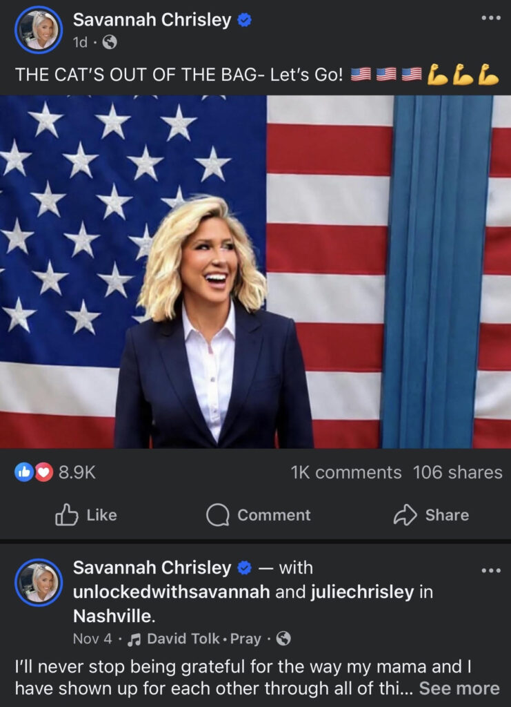 Savannah Chrisley’s parents are Todd and Julie Chrisley, who became famous through the reality show Chrisley Knows Best. They were convicted of tax evasion and fraud and served time in federal prison, though Savannah’s parents received pardons from President Trump earlier this year. After some time apart, they have reunited again.