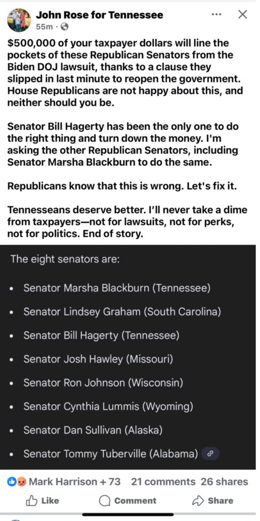 “The Senate should know better than to ask American taxpayers to foot the bill for the rogue actions of the DOJ under Joe Biden’s leadership,”Rep. Rose said. “Tennesseans have suffered enough because of the many failed policies of the last administration – and they shouldn’t be forced to pay more. I voted in favor of this funding bill because the government simply had to reopen. However, I am committed to making sure no Senator can enrich themselves from this vital bill to reopen the government.”