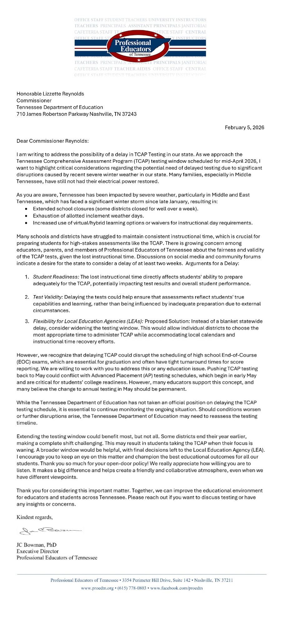 In the letter, Executive Director JC Bowman points out that our state has been affected by severe weather, particularly in Middle and East Tennessee. Bowman points out: “Many schools and districts have struggled to maintain consistent instructional time, which is crucial for preparing students for high-stakes assessments like the TCAP. There is growing concern among educators, parents, and members of Professional Educators of Tennessee about the fairness and validity of the TCAP tests, given the lost instructional time.”