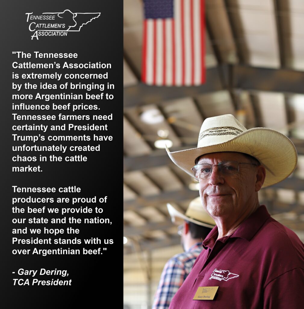 “The Tennessee Cattlemen’s Association is extremely concerned by the idea of bringing in more Argentinian beef to influence beef prices. Tennessee farmers need certainty and President Trump’s comments have unfortunately created chaos in the cattle market. Tennessee cattle producers are proud of the beef we provide to our state and the nation, and we hope the President stands with us over Argentinian beef.” – Gary Dering, TCA President