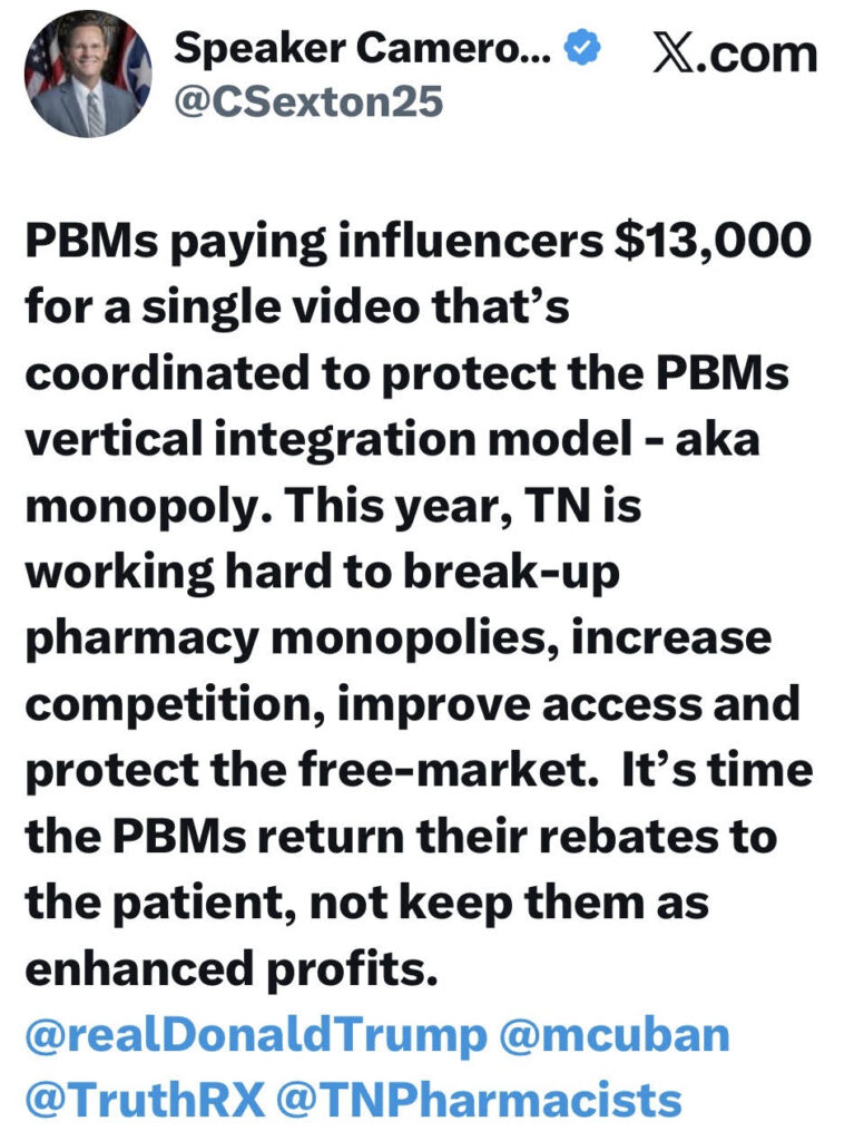 House Speaker Cam Sexton says “Poppycock” (or words to that effect) and questions the lobbying carpet bombing they are using to block the bill. There are reports that CVS is dumping over $1.5 million into its lobbying effort and another $7 million into paid media.