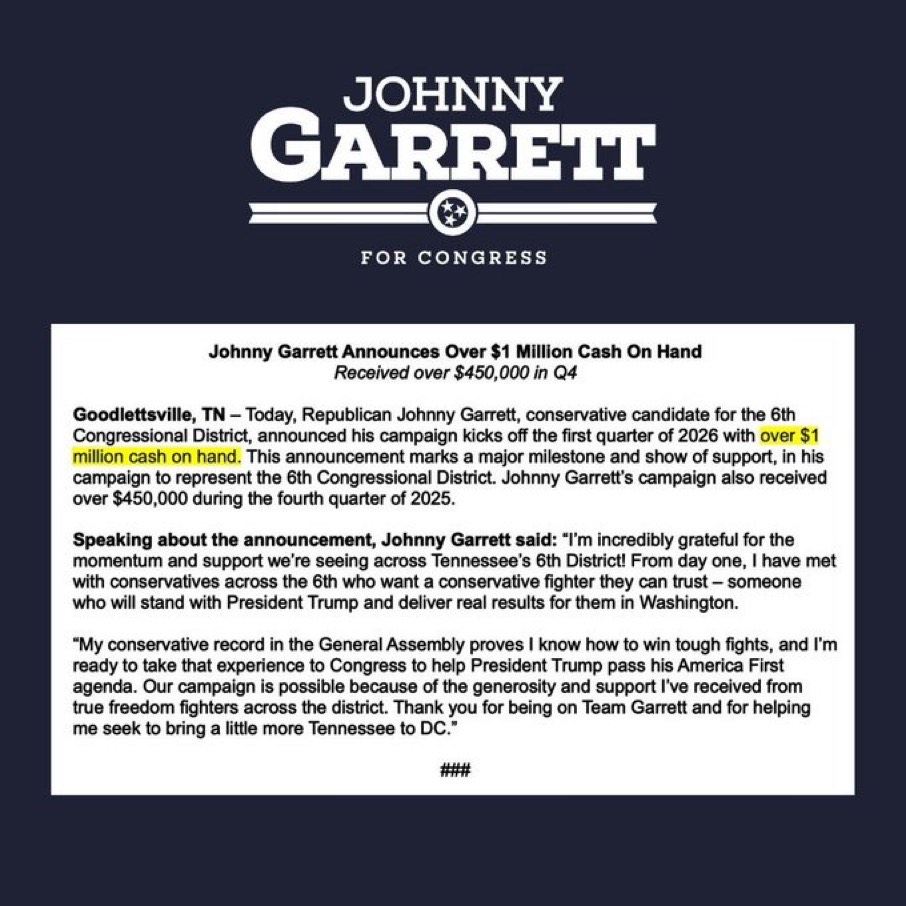 “SHOW ME THE MONEY!” The sixth congressional district Republican primary to fill the seat being vacated by GOP congressman John Rose is shaping up to be an expensive one. State Rep. Johnny Garrett and former Congressman Van Hilleary (more recently Rose’s Chief of Staff) each reported raising about $600,000 in the last family report last October. Now, Garrett reports having over $1 million cash on hand with the year end reporting period having just ended, with over $400,000 reported raised in the final quarter of 2025. Hilleary is expected to report similar numbers soon.