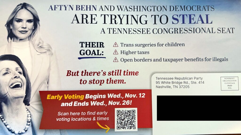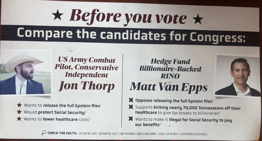 The Wilmington address has some suspecting that Biden money may be behind the effort to pull a few conservative votes away from Matt Van Epps. Independent Jon Thorp even uses helicopter imagery similar to Epps in order to confuse vote voters.